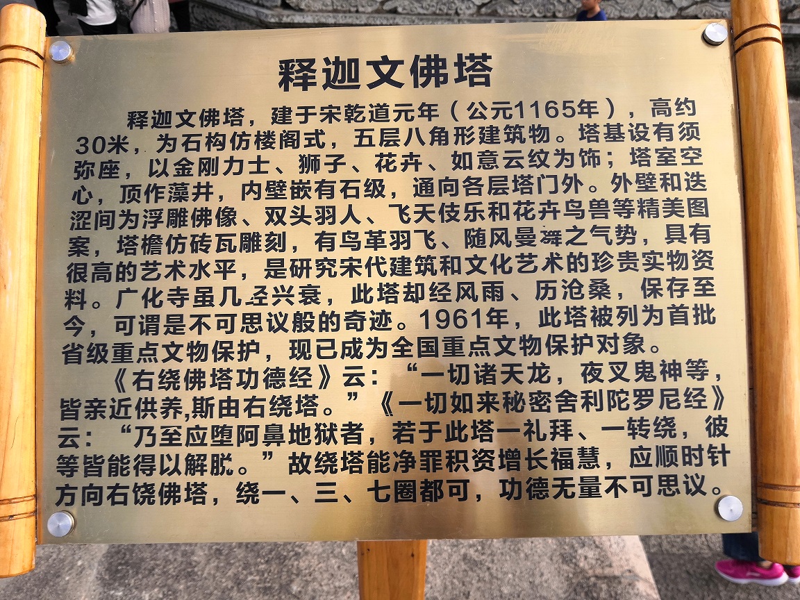 祭拜完文殊菩薩后,我們就來到了釋迦文佛塔,塔為石構(gòu)仿樓閣式,五層八角形,高約30米;塔室空心,頂作藻井, 內(nèi)壁嵌有石級,可登上各層塔門外;外壁和迭澀間浮雕佛像、雙頭羽人、飛天伎樂和花卉鳥獸等精美圖案,塔檐仿磚瓦雕刻,有鳥革羽軍 飛、凌風(fēng)飄舉之勢,具有很高的藝術(shù)水平,是研究宋代建筑和文化藝術(shù)的珍貴實物資料;廣化寺雖幾經(jīng)興衰,此塔卻依舊如故,保存至今,不能不說是一個奇跡。