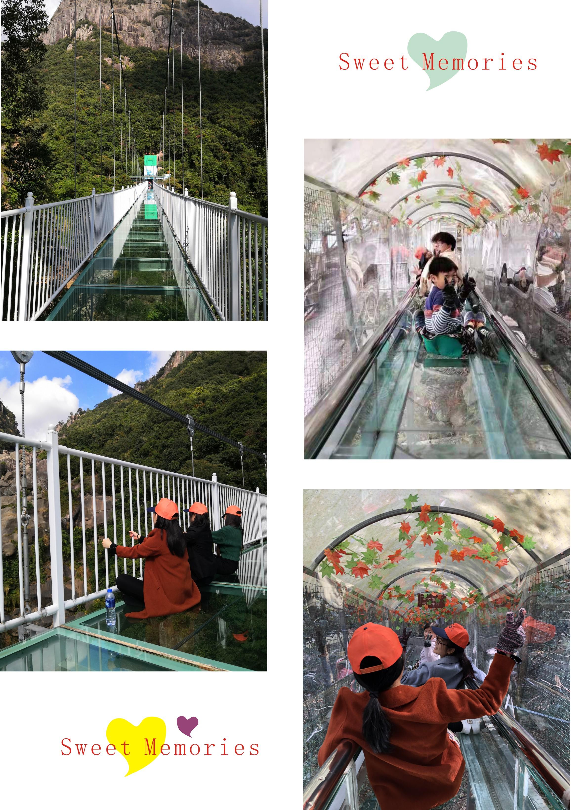 我們先到了大巴停車場,然后跟著導(dǎo)游一起來到了將軍漈一起合了張照片,祈福平安的觀音洞以及觀音圣水就在這里,隨后從將軍漈的石洞后面穿過準備去玻璃天橋和玻璃滑道,中間有一段路程經(jīng)過媽祖閣和鐵索橋,還有許多的臺階,讓你走到說累,到了玻璃天橋上,我們鞋子都套上了鞋套準備一睹玻璃天橋的美景,據(jù)說玻璃天橋全長300余米,距離地面200米,可以說是專治恐高得人;站在玻璃棧道上面,你可以見到九龍谷山行的全貌,下面是綠樹蔥蔥,如果是大霧天氣,就像是一座天橋,可見度更短,那樣更刺激,仿佛在天上行走,看不到遠處的玻璃橋?qū)τ诳指叩娜耸且环N很嚴肅的挑戰(zhàn),過了玻璃天橋,我們就來到了玻璃滑道,穿上了滑道褲以及保護手套,準備體驗玻璃滑道的驚險;